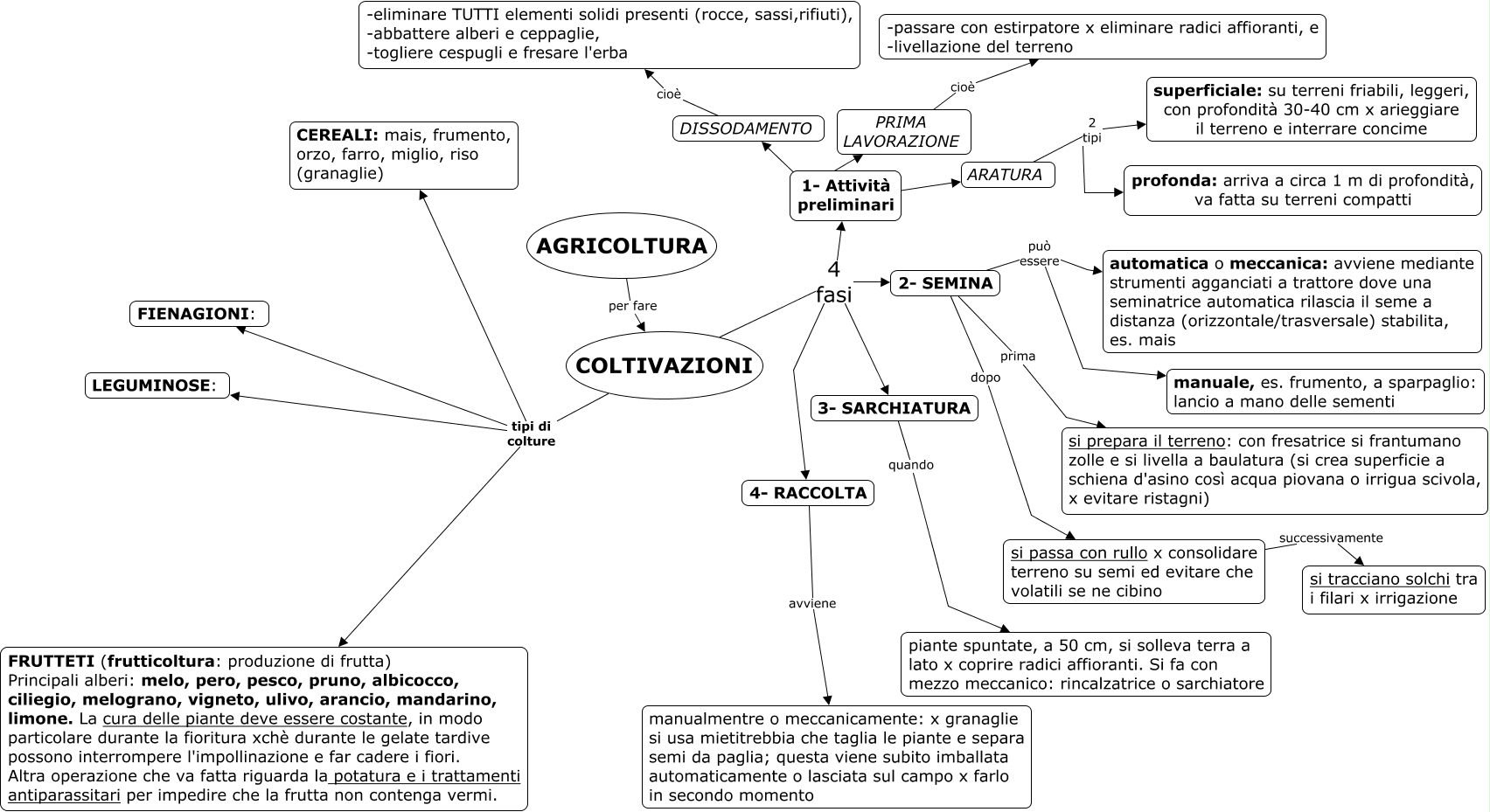 Questa Cmap, creata con IHMC CmapTools, contiene informazioni relative a: Agric_Coltivazioni2, ARATURA 2 tipi profonda: arriva a circa 1 m di profondità, va fatta su terreni compatti, 1- Attività preliminari ???? PRIMA LAVORAZIONE, COLTIVAZIONI 4 fasi 4- RACCOLTA, COLTIVAZIONI tipi di colture CEREALI: mais, frumento, orzo, farro, miglio, riso (granaglie), DISSODAMENTO cioè -eliminare TUTTI elementi solidi presenti (rocce, sassi,rifiuti), -abbattere alberi e ceppaglie, -togliere cespugli e fresare l'erba, 2- SEMINA può essere automatica o meccanica: avviene mediante strumenti agganciati a trattore dove una seminatrice automatica rilascia il seme a distanza (orizzontale/trasversale) stabilita, es. mais, 4- RACCOLTA avviene manualmentre o meccanicamente: x granaglie si usa mietitrebbia che taglia le piante e separa semi da paglia; questa viene subito imballata automaticamente o lasciata sul campo x farlo in secondo momento, COLTIVAZIONI tipi di colture FIENAGIONI:, 2- SEMINA può essere manuale, es. frumento, a sparpaglio: lancio a mano delle sementi, COLTIVAZIONI tipi di colture FRUTTETI (frutticoltura: produzione di frutta) Principali alberi: melo, pero, pesco, pruno, albicocco, ciliegio, melograno, vigneto, ulivo, arancio, mandarino, limone. La cura delle piante deve essere costante, in modo particolare durante la fioritura xchè durante le gelate tardive possono interrompere l'impollinazione e far cadere i fiori. Altra operazione che va fatta riguarda la potatura e i trattamenti antiparassitari per impedire che la frutta non contenga vermi., 1- Attività preliminari ???? ARATURA, 1- Attività preliminari ???? DISSODAMENTO, COLTIVAZIONI 4 fasi 2- SEMINA, si passa con rullo x consolidare terreno su semi ed evitare che volatili se ne cibino successivamente si tracciano solchi tra i filari x irrigazione, ARATURA 2 tipi superficiale: su terreni friabili, leggeri, con profondità 30-40 cm x arieggiare il terreno e interrare concime, COLTIVAZIONI 4 fasi 1- Attività preliminari, COLTIVAZIONI 4 fasi 3- SARCHIATURA, 2- SEMINA dopo si passa con rullo x consolidare terreno su semi ed evitare che volatili se ne cibino, 3- SARCHIATURA quando piante spuntate, a 50 cm, si solleva terra a lato x coprire radici affioranti. Si fa con mezzo meccanico: rincalzatrice o sarchiatore, AGRICOLTURA per fare COLTIVAZIONI