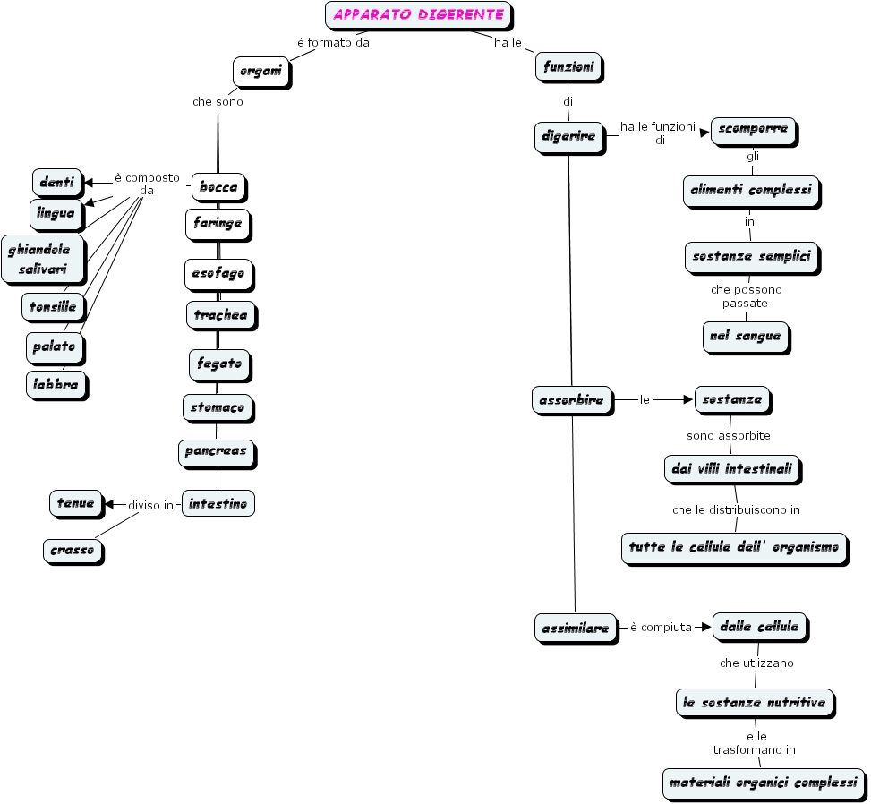 apparato digerente2, dai villi intestinali, fegato, funzioni, sostanze, crasso, organi, apparato digerente, palato, materiali organici complessi, dalle cellule, sostanze semplici, nel sangue, le sostanze nutritive, tenue, tutte le cellule dell' organismo, stomaco, assimilare, digerire, scomporre, tonsille, intestino, alimenti complessi, trachea, labbra, assorbire, ghiandole salivari, faringe, lingua, denti, bocca, esofago, pancreas