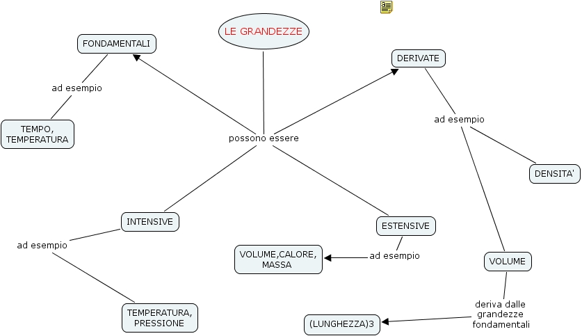 ESTENSIVE ad esempio VOLUME,CALORE, MASSA , LE GRANDEZZE possono essere INTENSIVE, LE GRANDEZZE possono essere FONDAMENTALI, LE GRANDEZZE possono essere ESTENSIVE, LE GRANDEZZE possono essere DERIVATE, VOLUME deriva dalle grandezze fondamentali (LUNGHEZZA)3, FONDAMENTALI ad esempio TEMPO, TEMPERATURA, INTENSIVE ad esempio TEMPERATURA, PRESSIONE, DERIVATE ad esempio DENSITA', DERIVATE ad esempio VOLUME
