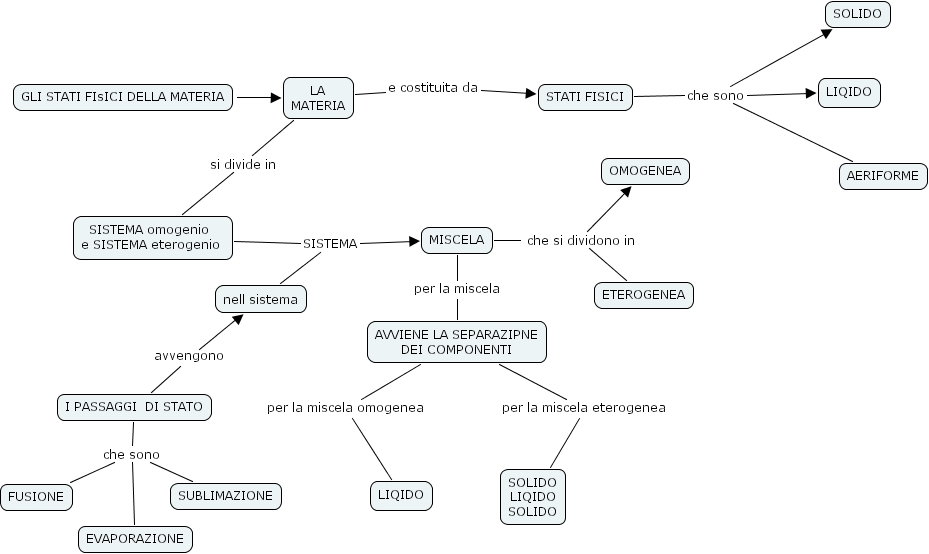 MISCELA che si dividono in ETEROGENEA, MISCELA che si dividono in OMOGENEA, AVVIENE LA SEPARAZIPNE DEI COMPONENTI per la miscela eterogenea SOLIDO LIQIDO SOLIDO, LA MATERIA si divide in SISTEMA omogenio e SISTEMA eterogenio , I PASSAGGI DI STATO avvengono nell sistema, STATI FISICI che sono LIQIDO, STATI FISICI che sono AERIFORME, STATI FISICI che sono SOLIDO, LA MATERIA e costituita da STATI FISICI, I PASSAGGI DI STATO che sono SUBLIMAZIONE, I PASSAGGI DI STATO che sono EVAPORAZIONE, I PASSAGGI DI STATO che sono FUSIONE, SISTEMA omogenio e SISTEMA eterogenio SISTEMA MISCELA, SISTEMA omogenio e SISTEMA eterogenio SISTEMA nell sistema, AVVIENE LA SEPARAZIPNE DEI COMPONENTI per la miscela omogenea LIQIDO, MISCELA per la miscela AVVIENE LA SEPARAZIPNE DEI COMPONENTI, GLI STATI FIsICI DELLA MATERIA ???? LA MATERIA