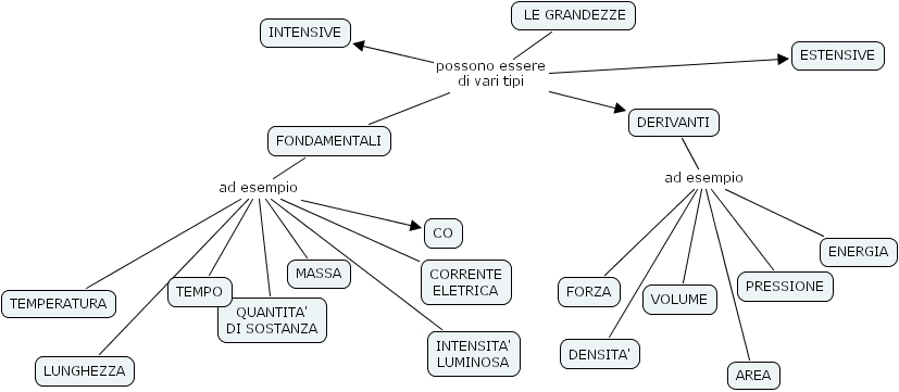 DERIVANTI ad esempio DENSITA', DERIVANTI ad esempio ENERGIA, DERIVANTI ad esempio AREA, DERIVANTI ad esempio PRESSIONE, DERIVANTI ad esempio FORZA, DERIVANTI ad esempio VOLUME, LE GRANDEZZE possono essere di vari tipi ESTENSIVE, LE GRANDEZZE possono essere di vari tipi DERIVANTI, LE GRANDEZZE possono essere di vari tipi FONDAMENTALI, LE GRANDEZZE possono essere di vari tipi INTENSIVE, FONDAMENTALI ad esempio TEMPO, FONDAMENTALI ad esempio INTENSITA' LUMINOSA, FONDAMENTALI ad esempio CO, FONDAMENTALI ad esempio LUNGHEZZA, FONDAMENTALI ad esempio TEMPERATURA, FONDAMENTALI ad esempio CORRENTE ELETRICA, FONDAMENTALI ad esempio MASSA, FONDAMENTALI ad esempio QUANTITA' DI SOSTANZA