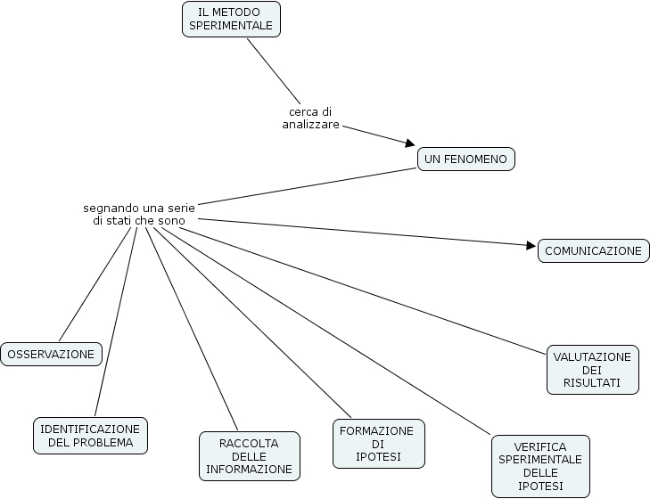 IL METODO SPERIMENTALE cerca di analizzare UN FENOMENO, UN FENOMENO segnando una serie di stati che sono COMUNICAZIONE, UN FENOMENO segnando una serie di stati che sono FORMAZIONE DI IPOTESI, UN FENOMENO segnando una serie di stati che sono VERIFICA SPERIMENTALE DELLE IPOTESI, UN FENOMENO segnando una serie di stati che sono OSSERVAZIONE, UN FENOMENO segnando una serie di stati che sono VALUTAZIONE DEI RISULTATI, UN FENOMENO segnando una serie di stati che sono RACCOLTA DELLE INFORMAZIONE, UN FENOMENO segnando una serie di stati che sono IDENTIFICAZIONE DEL PROBLEMA
