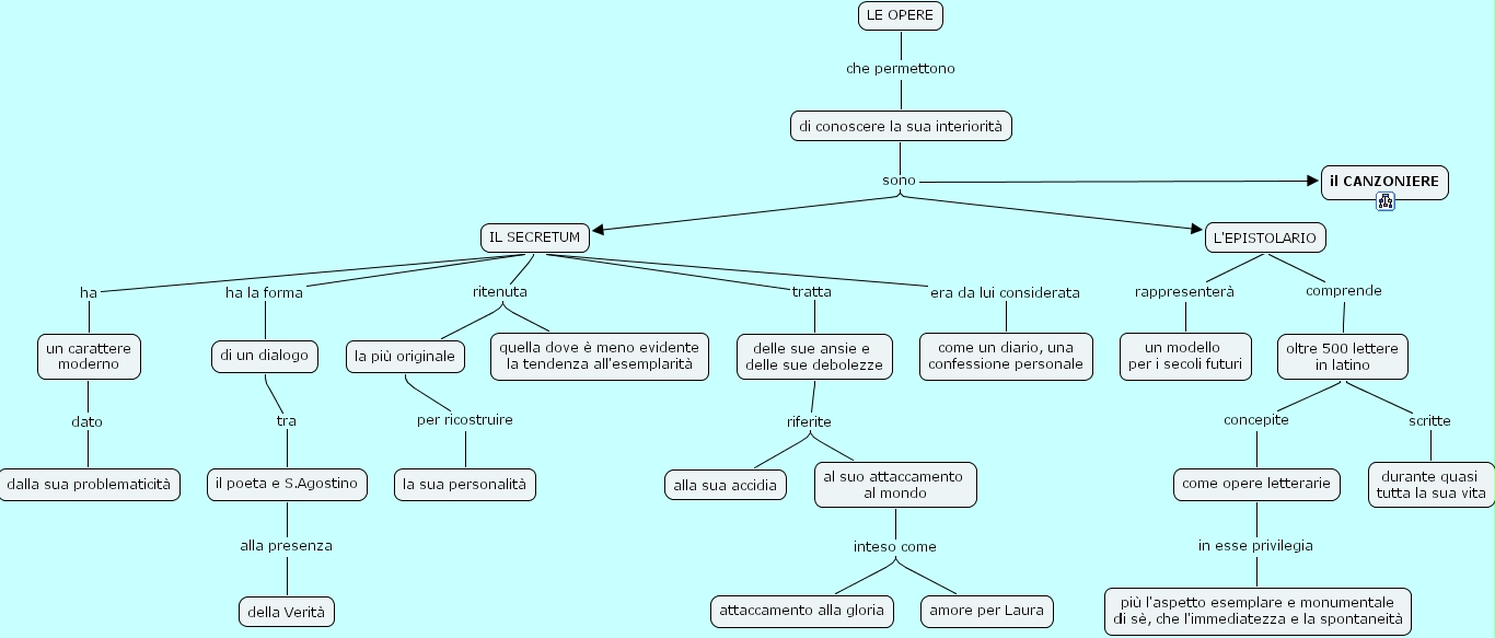 di conoscere la sua interiorit� sono L'EPISTOLARIO, di conoscere la sua interiorit� sono il CANZONIERE, di conoscere la sua interiorit� sono IL SECRETUM, IL SECRETUM ha un carattere moderno, al suo attaccamento al mondo inteso come attaccamento alla gloria, al suo attaccamento al mondo inteso come amore per Laura, la pi� originale per ricostruire la sua personalit�, IL SECRETUM tratta delle sue ansie e delle sue debolezze, un carattere moderno dato dalla sua problematicit�, oltre 500 lettere in latino concepite come opere letterarie, L'EPISTOLARIO rappresenter� un modello per i secoli futuri, come opere letterarie in esse privilegia pi� l'aspetto esemplare e monumentale di s�, che l'immediatezza e la spontaneit�, il poeta e S.Agostino alla presenza della Verit�, IL SECRETUM ha la forma di un dialogo, IL SECRETUM ritenuta quella dove � meno evidente la tendenza all'esemplarit�, IL SECRETUM ritenuta la pi� originale, oltre 500 lettere in latino scritte durante quasi tutta la sua vita, IL SECRETUM era da lui considerata come un diario, una confessione personale, delle sue ansie e delle sue debolezze riferite al suo attaccamento al mondo, delle sue ansie e delle sue debolezze riferite alla sua accidia, L'EPISTOLARIO comprende oltre 500 lettere in latino, LE OPERE che permettono di conoscere la sua interiorit�, di un dialogo tra il poeta e S.Agostino