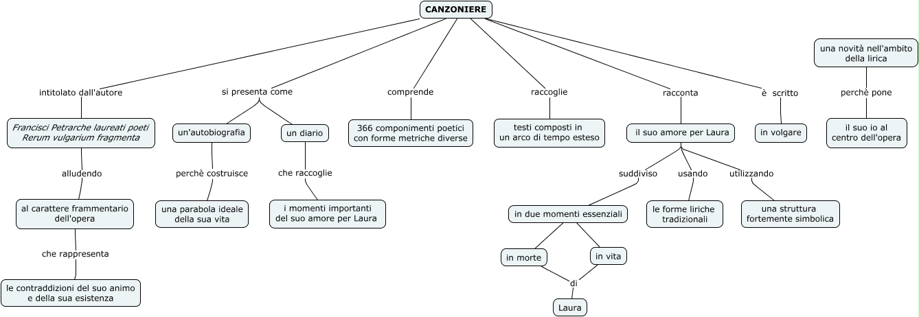 Questa Cmap, creata con IHMC CmapTools, contiene informazioni relative a: CANZONIERE, Francisci Petrarche laureati poeti Rerum vulgarium fragmenta alludendo al carattere frammentario dell'opera, in due momenti essenziali ???? in vita, il suo amore per Laura suddiviso in due momenti essenziali, in morte di Laura, il suo amore per Laura utilizzando una struttura fortemente simbolica, in vita di Laura, CANZONIERE racconta il suo amore per Laura, una novità nell'ambito della lirica perchè pone il suo io al centro dell'opera, CANZONIERE comprende 366 componimenti poetici con forme metriche diverse, CANZONIERE si presenta come un diario, un diario che raccoglie i momenti importanti del suo amore per Laura, CANZONIERE si presenta come un'autobiografia, un'autobiografia perchè costruisce una parabola ideale della sua vita, CANZONIERE è scritto in volgare, CANZONIERE intitolato dall'autore Francisci Petrarche laureati poeti Rerum vulgarium fragmenta, in due momenti essenziali ???? in morte, CANZONIERE raccoglie testi composti in un arco di tempo esteso, al carattere frammentario dell'opera che rappresenta le contraddizioni del suo animo e della sua esistenza, il suo amore per Laura usando le forme liriche tradizionali