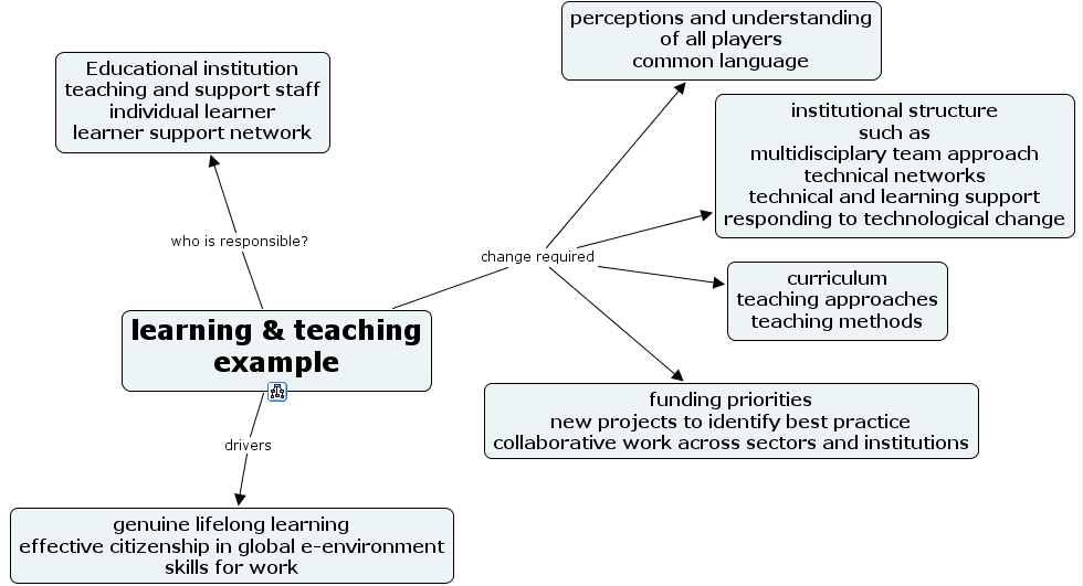 learning & teaching example, curriculum teaching approaches teaching methods, institutional structure such as multidisciplary team approach technical networks technical and learning support responding to technological change, perceptions and understanding of all players common language, educational institution teaching and support staff individual learner learner support network, funding priorities new projects to identify best practice collaborative work across sectors and institutions, genuine lifelong learning effective citizenship in global e-environment skills for work, learning & teaching example
