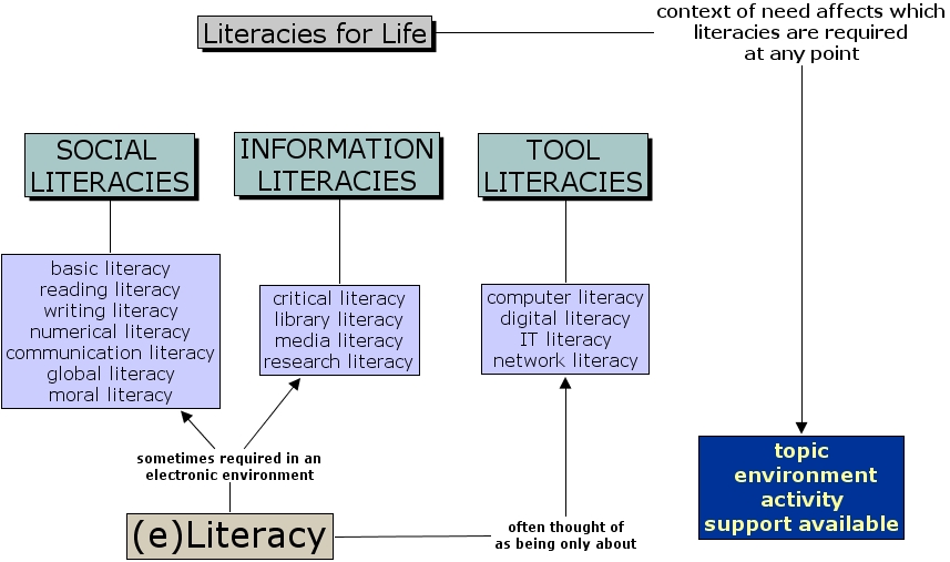 SOCIAL LITERACIES ???? basic literacy reading literacy writing literacy numerical literacy communication literacy global literacy moral literacy, TOOL LITERACIES ???? computer literacy digital literacy IT literacy network literacy, Literacies for Life context of need affects which literacies are required at any point topic environment activity support available, INFORMATION LITERACIES ???? critical literacy library literacy media literacy research literacy, (e)Literacy often thought of as being only about computer literacy digital literacy IT literacy network literacy, (e)Literacy sometimes required in an electronic environment basic literacy reading literacy writing literacy numerical literacy communication literacy global literacy moral literacy, (e)Literacy sometimes required in an electronic environment critical literacy library literacy media literacy research literacy
