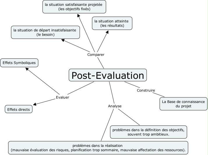 Post-Evaluation Construire La Base de connaissance du projet, Post-Evaluation Comparer la situation satisfaisante projet�e (les objectifs fix�s), Post-Evaluation Comparer la situation de d�part insatisfaisante (le besoin), Post-Evaluation Comparer la situation atteinte (les r�sultats), Post-Evaluation Evaluer Effets directs, Post-Evaluation Evaluer Effets Symboliques, Post-Evaluation Analyse probl�mes dans la d�finition des objectifs, souvent trop ambitieux., Post-Evaluation Analyse probl�mes dans la r�alisation (mauvaise �valuation des risques, planification trop sommaire, mauvaise affectation des ressources).