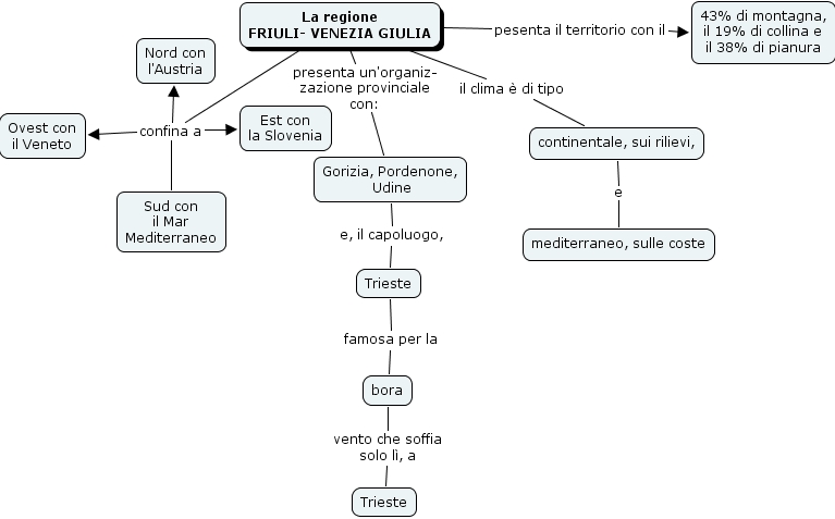 La regione FRIULI- VENEZIA GIULIA presenta un'organiz- zazione provinciale con: Gorizia, Pordenone, Udine, Trieste famosa per la bora, La regione FRIULI- VENEZIA GIULIA pesenta il territorio con il 43% di montagna, il 19% di collina e il 38% di pianura, continentale, sui rilievi, e mediterraneo, sulle coste, bora vento che soffia solo l�, a Trieste, La regione FRIULI- VENEZIA GIULIA il clima � di tipo continentale, sui rilievi,, Gorizia, Pordenone, Udine e, il capoluogo, Trieste, La regione FRIULI- VENEZIA GIULIA confina a Sud con il Mar Mediterraneo, La regione FRIULI- VENEZIA GIULIA confina a Ovest con il Veneto, La regione FRIULI- VENEZIA GIULIA confina a Est con la Slovenia, La regione FRIULI- VENEZIA GIULIA confina a Nord con l'Austria