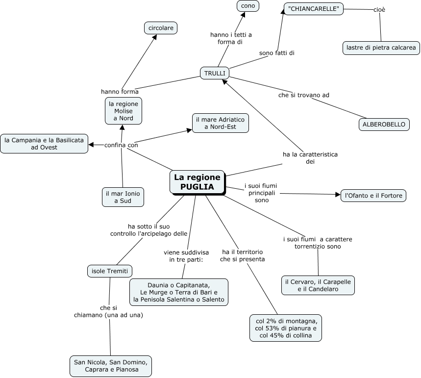 Questa Cmap, creata con IHMC CmapTools, contiene informazioni relative a: La Regione Puglia, TRULLI hanno i tetti a forma di cono, La regione PUGLIA confina con la regione Molise a Nord, isole Tremiti che si chiamano (una ad una) San Nicola, San Domino, Caprara e Pianosa, La regione PUGLIA ha la caratteristica dei TRULLI, "CHIANCARELLE" cioè lastre di pietra calcarea, La regione PUGLIA confina con il mar Ionio a Sud, La regione PUGLIA ha sotto il suo controllo l'arcipelago delle isole Tremiti, La regione PUGLIA viene suddivisa in tre parti: Daunia o Capitanata, Le Murge o Terra di Bari e la Penisola Salentina o Salento, La regione PUGLIA i suoi fiumi principali sono l'Ofanto e il Fortore, TRULLI hanno forma circolare, La regione PUGLIA i suoi fiumi a carattere torrentizio sono il Cervaro, il Carapelle e il Candelaro, La regione PUGLIA ha il territorio che si presenta col 2% di montagna, col 53% di pianura e col 45% di collina, TRULLI che si trovano ad ALBEROBELLO, La regione PUGLIA confina con il mare Adriatico a Nord-Est, TRULLI sono fatti di "CHIANCARELLE", La regione PUGLIA confina con la Campania e la Basilicata ad Ovest
