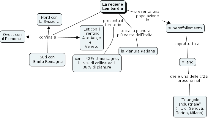 La regione Lombardia presenta il territorio con il 42% dimontagne, il 19% di colline ed il 38% di pianure, La regione Lombardia presenta una popolazione in superaffollamento, superaffollamento soprattutto a Milano, La regione Lombardia confina a Ovest con il Piemonte, La regione Lombardia confina a Est con il Trentino Alto Adige e il Veneto, La regione Lombardia confina a Nord con la Svizzera, La regione Lombardia confina a Sud con l'Emilia Romagna, La regione Lombardia tocca la pianura pi� vasta dell'Italia: la Pianura Padana, Milano che � una delle citt� presenti nel "Triangolo Industriale" (T.I. di Genova, Torino, Milano)