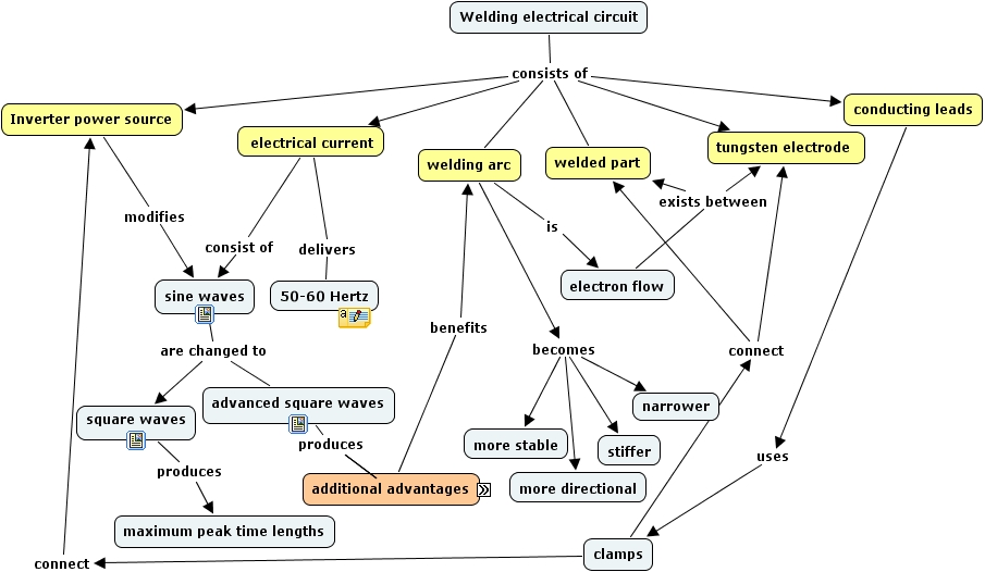 clamps connect tungsten electrode, clamps connect welded part, electrical current delivers 50-60 Hertz, Inverter power source modifies sine waves, advanced square waves produces maximum cycles per second, advanced square waves produces maximum peak time lengths, advanced square waves produces maximum wave amplitude, conducting leads uses clamps, additional advantages benefits welding arc, clamps connect Inverter power source, square waves produces maximum peak time lengths, welding arc becomes narrower, welding arc becomes more directional, welding arc becomes more stable, welding arc becomes stiffer, electrical current consist of sine waves, sine waves are changed to square waves, sine waves are changed to advanced square waves, welding arc is electron flow, electron flow exists between welded part, electron flow exists between tungsten electrode, Welding electrical circuit consists of tungsten electrode, Welding electrical circuit consists of welded part, Welding electrical circuit consists of Inverter power source, Welding electrical circuit consists of welding arc, Welding electrical circuit consists of conducting leads, Welding electrical circuit consists of electrical current, maximum cycles per second eg 50000 Hertz