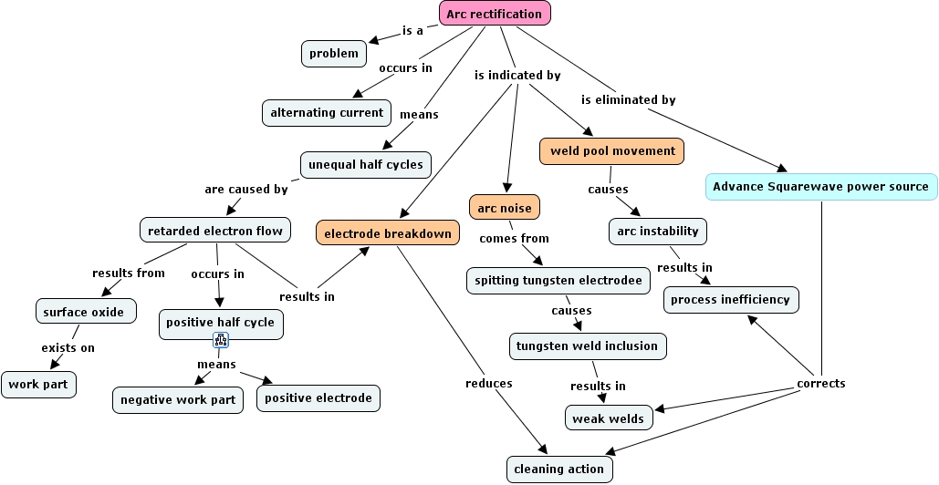 positive half cycle means positive electrode, positive half cycle means negative work part, surface oxide exists on work part, tungsten weld inclusion results in weak welds, arc noise comes from spitting tungsten electrodee, weld pool movement causes arc instability, Arc rectification is a problem, spitting tungsten electrodee causes tungsten weld inclusion, Arc rectification is indicated by arc noise, Arc rectification is indicated by weld pool movement, Arc rectification is indicated by electrode breakdown, electrode breakdown reduces cleaning action, retarded electron flow results from surface oxide, Advance Squarewave power source corrects cleaning action, Advance Squarewave power source corrects process inefficiency, Advance Squarewave power source corrects weak welds, Arc rectification means unequal half cycles, retarded electron flow results in electrode breakdown, arc instability results in process inefficiency, unequal half cycles are caused by retarded electron flow, retarded electron flow occurs in positive half cycle, Arc rectification is eliminated by Advance Squarewave power source, Arc rectification occurs in alternating current