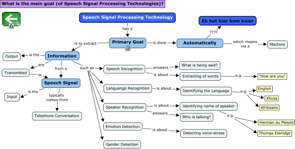 This Concept Map, created with IHMC CmapTools, has information related to: 1.1 Introduction - Main Goal, Automatically ???? Ek het hier kom kuier, Information are Transmitted, Speech Signal typically comes from Telephone Conversation, Information is the Output, Information such as Emotion Detection, Information such as Speech Recognition, Extracting of words e.g. "How are you", Transmitted in Speech Signal, Identifying the Language e.g. English, Speech Recognition answers What is being said?, Emotion Detection is about Detecting voice-stress, Identifying name of speaker e.g. Thomas Eskridge, Information such as Languange Recognition, Speech Recognition is about Extracting of words, Automatically which means via a Machine, Primary Goal is to extract Information, Speaker Recognition answers Who is talking?, Identifying name of speaker e.g. Herman du Plessis, Speech Signal Processing Technology has a Primary Goal, Languange Recognition is about Identifying the Language
