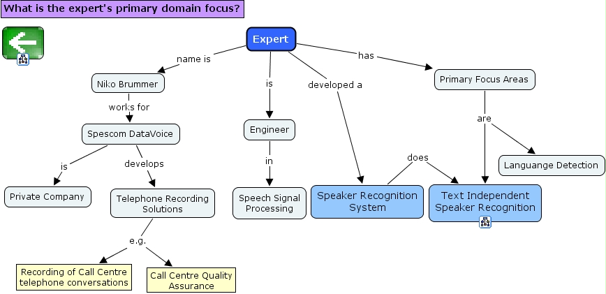 1.3 About Expert, Speaker Recognition System does Text Independent Speaker Recognition, Expert developed a Speaker Recognition System, Primary Focus Areas are Languange Detection, Engineer in Speech Signal Processing, Expert name is Niko Brummer, Spescom DataVoice develops Telephone Recording Solutions, Expert is Engineer, Spescom DataVoice is Private Company, Expert has Primary Focus Areas, Primary Focus Areas are Text Independent Speaker Recognition