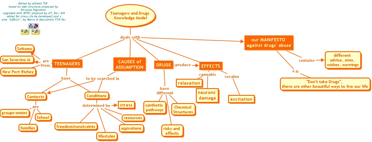 Home TAD C-map, Conditions determined by resources, TEENAGERS have Contexts, DRUGS have different Chemical Structures, TEENAGERS have Conditions, Contexts are families, EFFECTS cannabis relaxation, our MANIFESTO against drugs' abuse e.g. "Don't take Drugs", there are other beautiful ways to live our life, EFFECTS cocaine excitation, Conditions determined by stress, DRUGS have different synthetic pathways