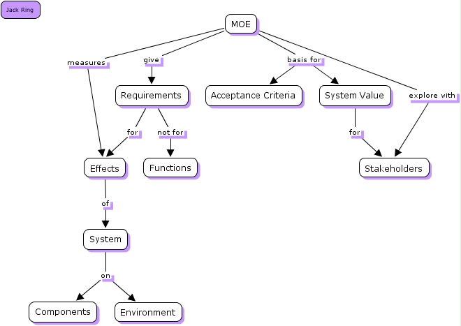 MOEs, System on Environment, System Value for Stakeholders, System on Components, Requirements not for Functions, MOE basis for System Value, Requirements for Effects, MOE explore with Stakeholders, MOE basis for Acceptance Criteria, MOE give Requirements, MOE measures Effects