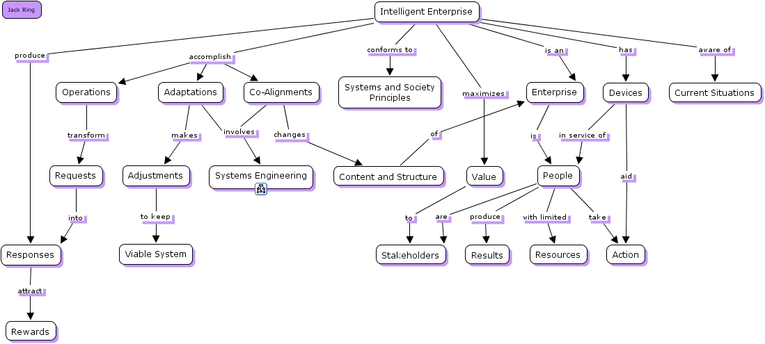 Intelligent Enterprise, Intelligent Enterprise accomplish Adaptations, People are Stakeholders, People take Action, Intelligent Enterprise accomplish Operations, Responses attract Rewards, Co-Alignments changes Content and Structure, People produce Results, Intelligent Enterprise conforms to Systems and Society Principles, Responses attract Rewards, Value to Stakeholders