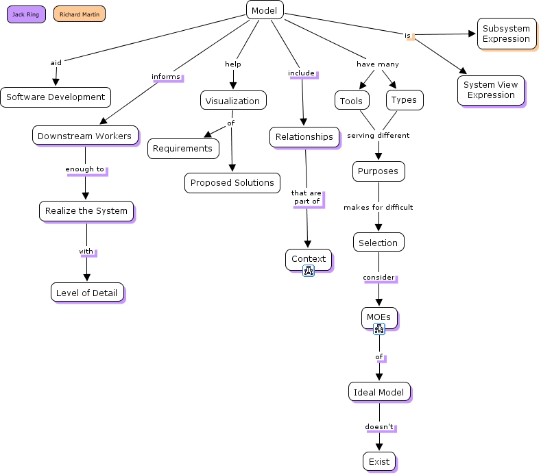 Model, Visualization of Requirements, Visualization of Proposed Solutions, Model aid Software Development, Ideal Model doesn't Exist, Relationships that are part of Context, Realize the System with Level of Detail, Model have many Types, Downstream Workers enough to Realize the System, Model is System View Expression, MOEs of Ideal Model