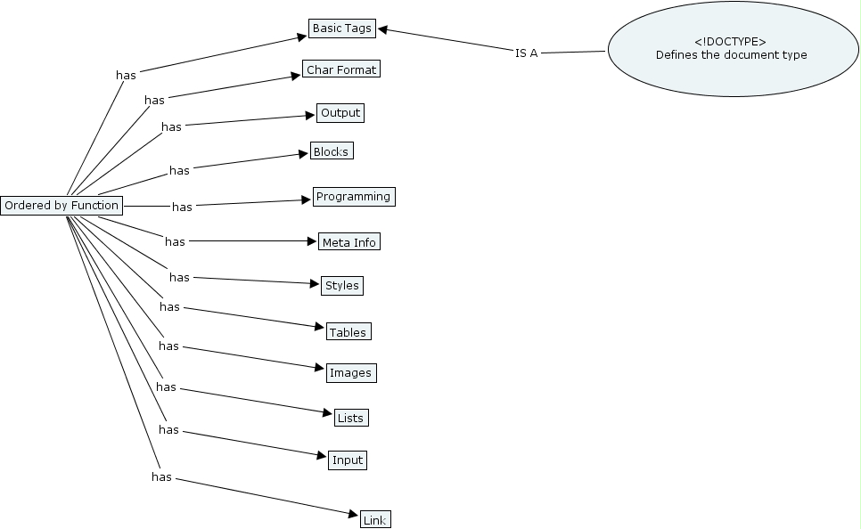 Ordered by Function, Ordered by Function has Tables, Ordered by Function has Link, Ordered by Function has Basic Tags, Ordered by Function has Input, Ordered by Function has Programming, Ordered by Function has Styles, Ordered by Function has Meta Info, Ordered by Function has Images, Ordered by Function has Lists, Ordered by Function has Output