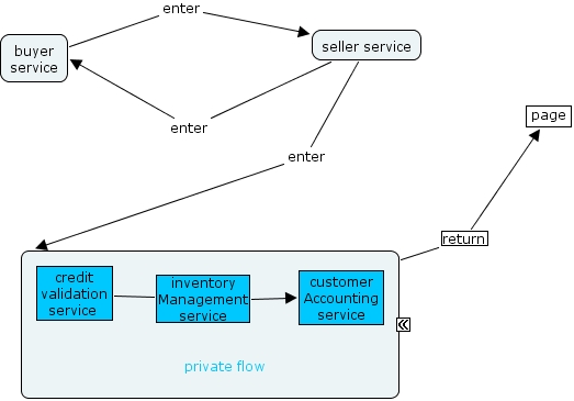 web service, private flow return page, buyer service enter seller service, seller service enter private flow, credit validation service inventory Management service customer Accounting service, seller service enter buyer service