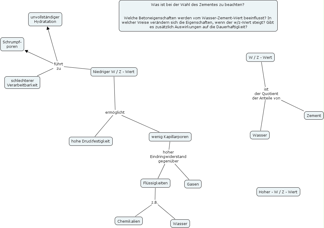 zementauswahl-und-wz-wert, Niedriger W / Z - Wert führt zu schlechterer Verarbeitbarkeit, Niedriger W / Z - Wert ermöglicht wenig Kapillarporen, W / Z - Wert ist der Quotient der Anteile von Zement, Niedriger W / Z - Wert führt zu Schrumpf- poren, Niedriger W / Z - Wert ermöglicht hohe Druckfestigkeit, Niedriger W / Z - Wert führt zu unvollständiger Hydratation, W / Z - Wert ist der Quotient der Anteile von Wasser, wenig Kapillarporen hoher Eindringwiderstand gegenüber Gasen, wenig Kapillarporen hoher Eindringwiderstand gegenüber Flüssigkeiten, Flüssigkeiten z.B. Chemikalien