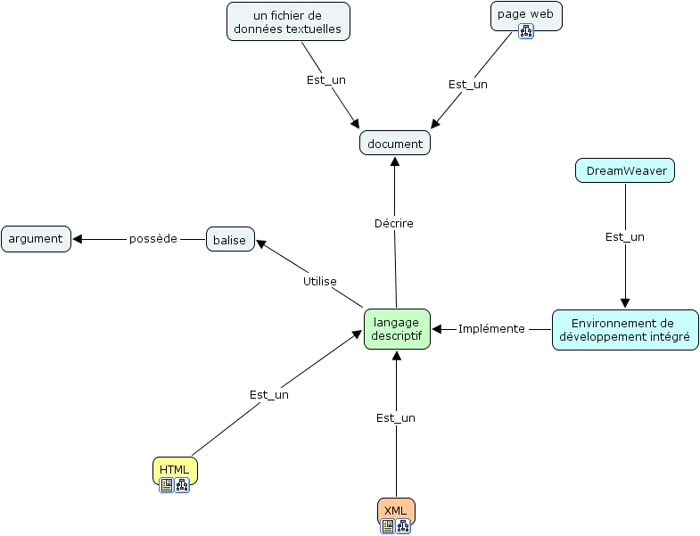 Langage descr, DreamWeaver Est_un Environnement de développement intégré, XML Est_un langage descriptif, langage descriptif Décrire document, page web Est_un document, langage descriptif Utilise balise, Environnement de développement intégré Implémente langage descriptif, HTML Est_un langage descriptif, balise possède argument, un fichier de données textuelles Est_un document