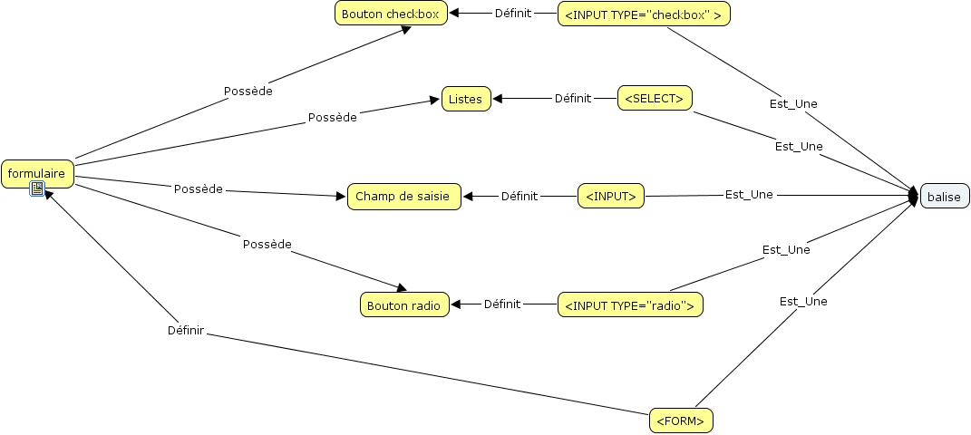 formulaire, formulaire Possède Bouton radio, <SELECT> Est_Une balise, <INPUT TYPE="checkbox" > Définit Bouton checkbox, <INPUT TYPE="checkbox" > Est_Une balise, <INPUT TYPE="radio"> Définit Bouton radio, formulaire Possède Champ de saisie, <FORM> Définir formulaire, <INPUT> Est_Une balise, formulaire Possède Listes, <SELECT> Définit Listes