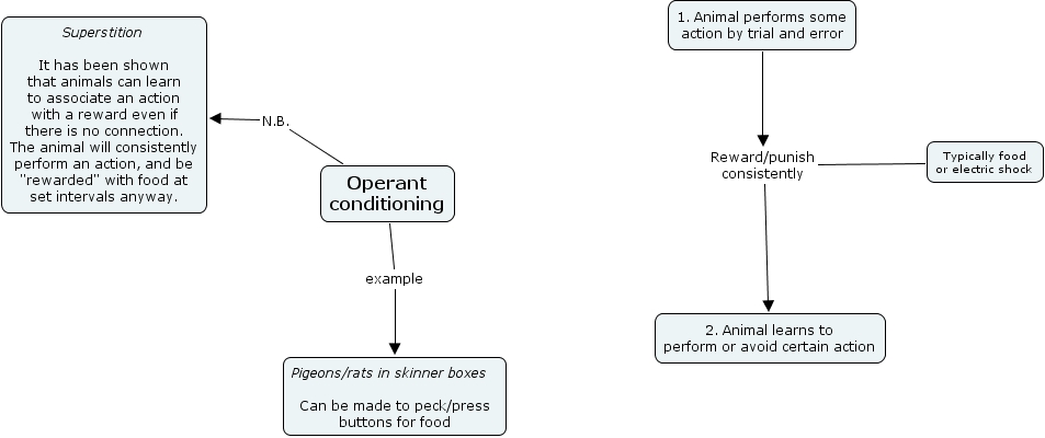 Operant conditioning Tom K, 1. Animal performs some action by trial and error Reward/punish consistently Typically food or electric shock, Operant conditioning example Pigeons/rats in skinner boxes Can be made to peck/press buttons for food, 1. Animal performs some action by trial and error Reward/punish consistently 2. Animal learns to perform or avoid certain action, Operant conditioning N.B. Superstition It has been shown that animals can learn to associate an action with a reward even if there is no connection. The animal will consistently perform an action, and be "rewarded" with food at set intervals anyway.