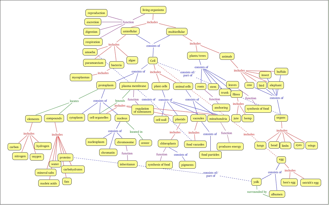 Cell Structure and Function, organs includes limbs, bird consists of organs, vacoules consists of food particles, cell organelles includes plastids, elements includes nitrogen, plants/trees consists of leaves, vacoules includes food vacuoles, leaves function synthesis of food, fibres includes jute, elephant consists of organs