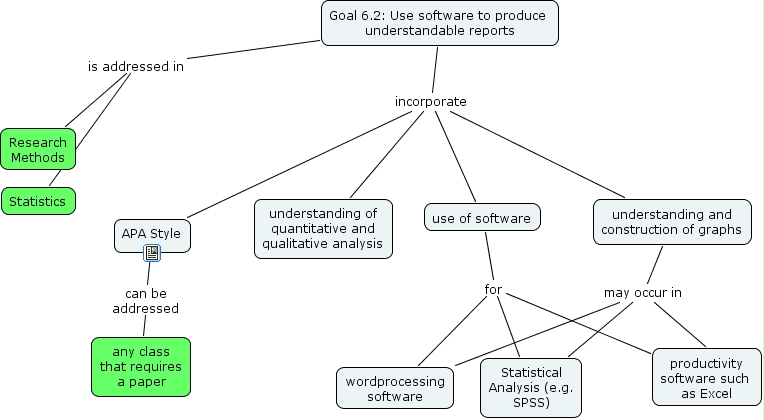 Learning Goal 6.2, Goal 6.2: Use software to produce understandable reports incorporate understanding and construction of graphs, use of software for wordprocessing software, use of software for Statistical Analysis (e.g. SPSS), use of software for wordprocessing software, APA Style can be addressed any class that requires a paper, Goal 6.2: Use software to produce understandable reports incorporate use of software, Goal 6.2: Use software to produce understandable reports incorporate understanding of quantitative and qualitative analysis, use of software for productivity software such as Excel, understanding and construction of graphs may occur in wordprocessing software, Goal 6.2: Use software to produce understandable reports is addressed in Research Methods