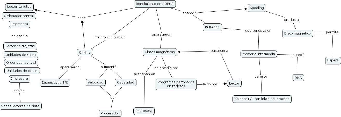 Cintas magn�ticas acababan en Impresora, Cintas magn�ticas se acced�a por Programas perforados en tarjetas, Rendimiento en SOP(s) de Lector tarjetas, Velocidad del Procesador, Lector pasaban a Cintas magn�ticas, Buffering que consiste en Memoria intermedia, Rendimiento en SOP(s) mejor� con trabajo Off-line, Programas perforados en tarjetas le�do por Lector, Impresora hab�an Varias lectoras de cinta, Memoria intermedia permite Solapar E/S con inicio del proceso, Capacidad del Procesador, Rendimiento en SOP(s) apareci� Buffering, Rendimiento en SOP(s) apareci� Spooling, Memoria intermedia apareci� DMA, Spooling gracias al Disco magn�tico, Rendimiento en SOP(s) aparecieron Cintas magn�ticas, Disco magn�tico permite Espera, Off-line aparecieron Dispositivos E/S, Impresora se pas� a Lector de trajetas, Off-line de Lector tarjetas, Off-line au�ment� Velocidad, Off-line au�ment� Capacidad