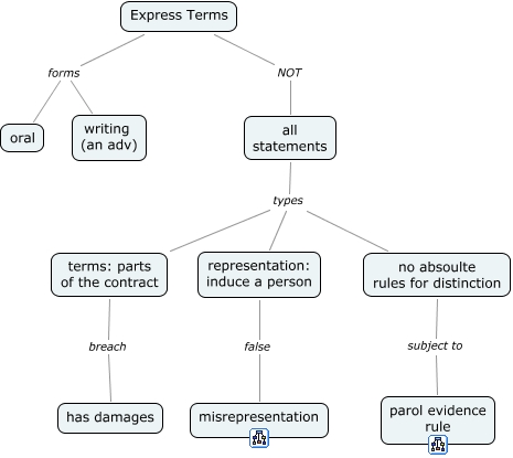 Express Terms, no absoulte rules for distinction subject to parol evidence rule, representation: induce a person false misrepresentation, all statements types no absoulte rules for distinction, all statements types representation: induce a person, terms: parts of the contract breach has damages, Express Terms forms oral, Express Terms NOT all statements, Express Terms forms writing (an adv), all statements types terms: parts of the contract