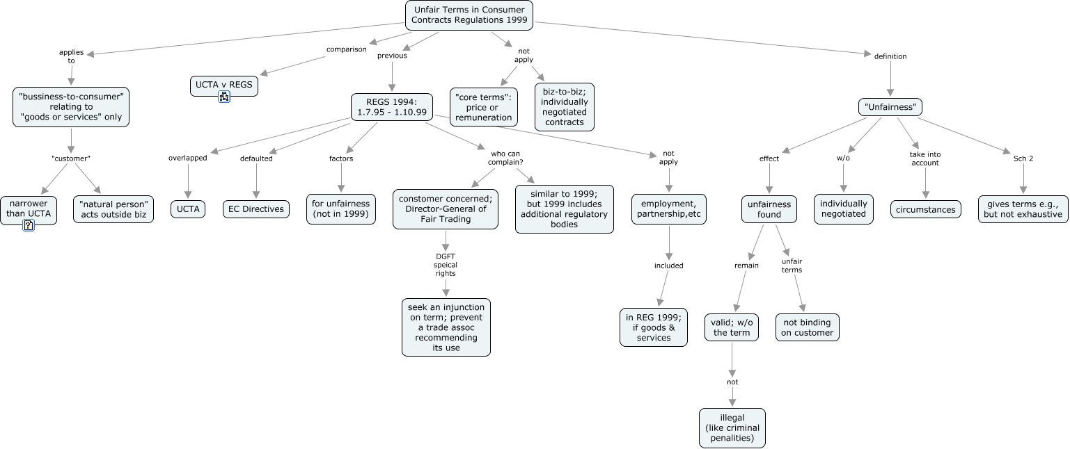 REGS 1999, "Unfairness" Sch 2 gives terms e.g., but not exhaustive, Unfair Terms in Consumer Contracts Regulations 1999 not apply "core terms": price or remuneration, REGS 1994: 1.7.95 - 1.10.99 defaulted EC Directives, unfairness found unfair terms not binding on customer, Unfair Terms in Consumer Contracts Regulations 1999 definition "Unfairness", Unfair Terms in Consumer Contracts Regulations 1999 not apply biz-to-biz; individually negotiated contracts, Unfair Terms in Consumer Contracts Regulations 1999 previous REGS 1994: 1.7.95 - 1.10.99, employment, partnership,etc included in REG 1999; if goods & services, Unfair Terms in Consumer Contracts Regulations 1999 applies to "bussiness-to-consumer" relating to "goods or services" only, "Unfairness" take into account circumstances