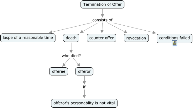 Termination of Offer, Termination of Offer consists of revocation, Termination of Offer consists of conditions failed, Termination of Offer consists of laspe of a reasonable time, Termination of Offer consists of death, offeror if offeror's personablity is not vital, Termination of Offer consists of counter offer, death who died? offeror, death who died? offeree