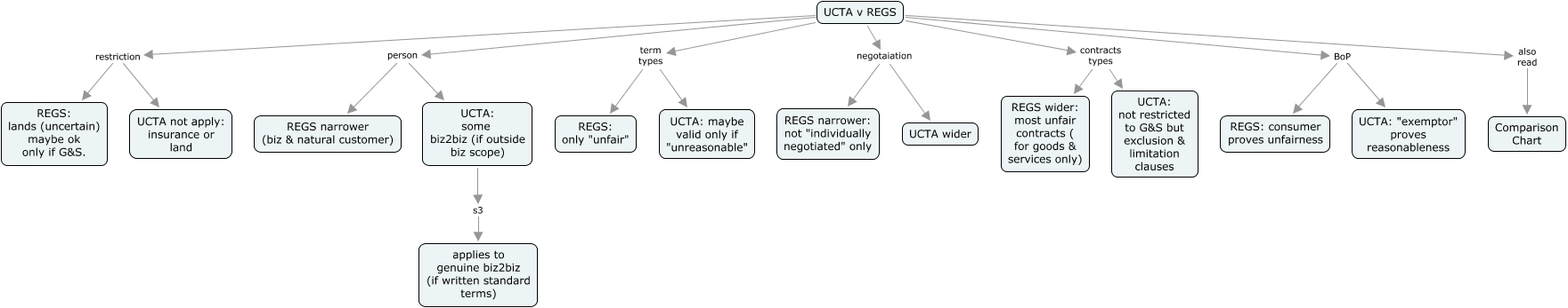 UCTA v REGS, UCTA v REGS negotaiation REGS narrower: not "individually negotiated" only, UCTA v REGS BoP REGS: consumer proves unfairness, UCTA: some biz2biz (if outside biz scope) s3 applies to genuine biz2biz (if written standard terms), UCTA v REGS restriction UCTA not apply: insurance or land, UCTA v REGS person UCTA: some biz2biz (if outside biz scope), UCTA v REGS term types REGS: only "unfair", UCTA v REGS also read Comparison Chart, UCTA v REGS BoP UCTA: "exemptor" proves reasonableness, UCTA v REGS contracts types UCTA: not restricted to G&S but exclusion & limitation clauses, UCTA v REGS term types UCTA: maybe valid only if "unreasonable"