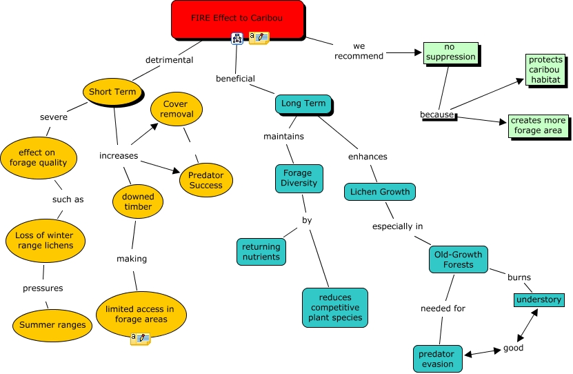 Fire effects on Woodland Caribou, Long Term maintains Forage Diversity, effect on forage quality such as Loss of winter range lichens, no suppression because creates more forage area, Short Term increases downed timber, Cover removal Predator Success, predator evasion good understory, Short Term severe effect on forage quality, Short Term increases Cover removal, Short Term increases Predator Success, FIRE Effect to Caribou detrimental Short Term