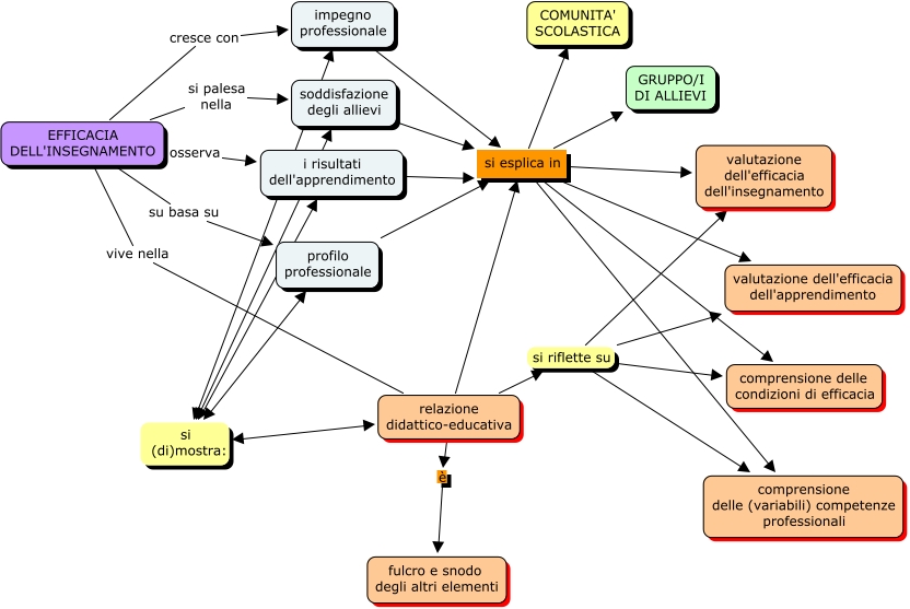 modellosistemico, EFFICACIA DELL'INSEGNAMENTO su basa su profilo professionale, i risultati dell'apprendimento si esplica in valutazione dell'efficacia dell'insegnamento, EFFICACIA DELL'INSEGNAMENTO si palesa nella soddisfazione degli allievi, profilo professionale si esplica in COMUNITA' SCOLASTICA, soddisfazione degli allievi si esplica in comprensione delle (variabili) competenze professionali, relazione didattico-educativa è fulcro e snodo degli altri elementi, i risultati dell'apprendimento si esplica in valutazione dell'efficacia dell'apprendimento, relazione didattico-educativa si (di)mostra: impegno professionale, relazione didattico-educativa si esplica in COMUNITA' SCOLASTICA, relazione didattico-educativa si riflette su valutazione dell'efficacia dell'insegnamento