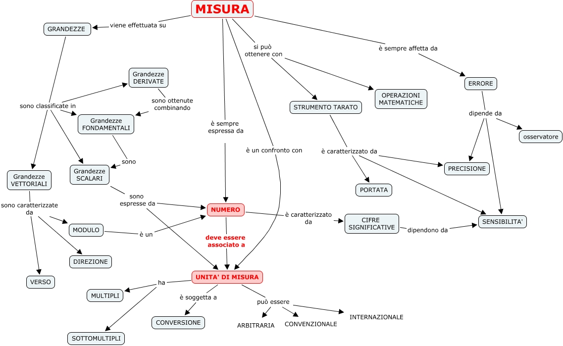 MISURA1, ERRORE dipende da SENSIBILITA', STRUMENTO TARATO è caratterizzato da SENSIBILITA', ERRORE dipende da PRECISIONE, Grandezze SCALARI sono espresse da UNITA' DI MISURA, CIFRE SIGNIFICATIVE dipendono da SENSIBILITA', Grandezze DERIVATE sono ottenute combinando Grandezze FONDAMENTALI, STRUMENTO TARATO è caratterizzato da PORTATA, GRANDEZZE sono classificate in Grandezze DERIVATE, STRUMENTO TARATO è caratterizzato da PRECISIONE, Grandezze FONDAMENTALI sono Grandezze SCALARI