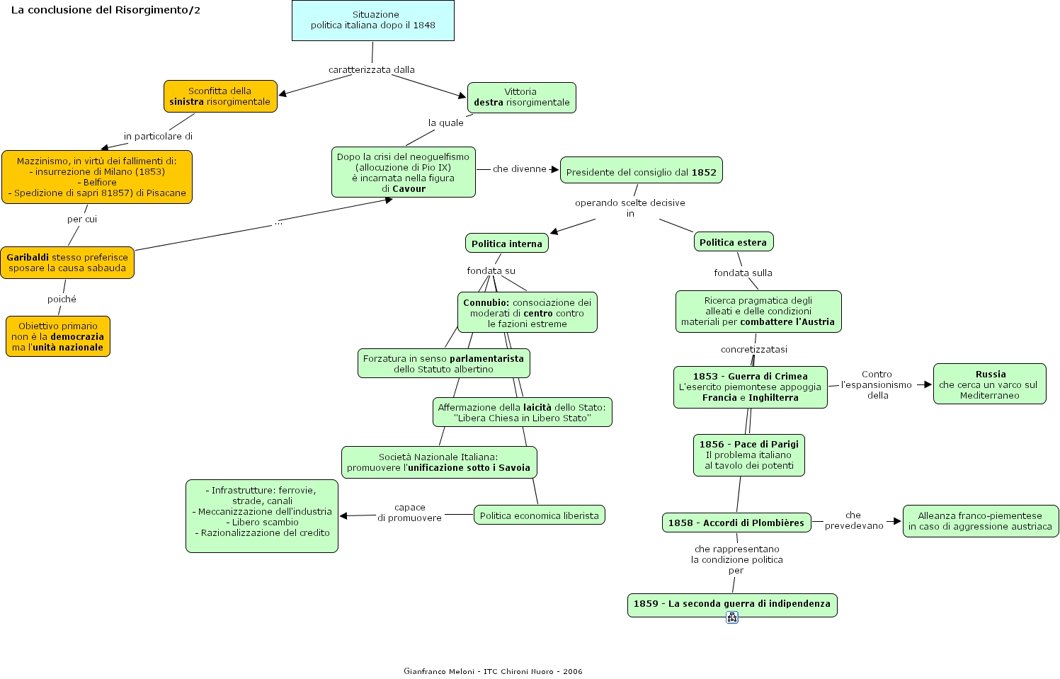 unificazione_italiana_2, 1858 - Accordi di Plombières che prevedevano Alleanza franco-piementese in caso di aggressione austriaca, Ricerca pragmatica degli alleati e delle condizioni materiali per combattere l'Austria concretizzatasi 1853 - Guerra di Crimea L'esercito piemontese appoggia Francia e Inghilterra, Garibaldi stesso preferisce sposare la causa sabauda ... Dopo la crisi del neoguelfismo (allocuzione di Pio IX) è incarnata nella figura di Cavour, Situazione politica italiana dopo il 1848 caratterizzata dalla Vittoria destra risorgimentale, Politica interna fondata su Politica economica liberista, Ricerca pragmatica degli alleati e delle condizioni materiali per combattere l'Austria concretizzatasi 1858 - Accordi di Plombières, Dopo la crisi del neoguelfismo (allocuzione di Pio IX) è incarnata nella figura di Cavour che divenne Presidente del consiglio dal 1852, Politica interna fondata su Società Nazionale Italiana: promuovere l'unificazione sotto i Savoia, Mazzinismo, in virtù dei fallimenti di: - insurrezione di Milano (1853) - Belfiore - Spedizione di sapri 81857) di Pisacane per cui Garibaldi stesso preferisce sposare la causa sabauda, Politica estera fondata sulla Ricerca pragmatica degli alleati e delle condizioni materiali per combattere l'Austria