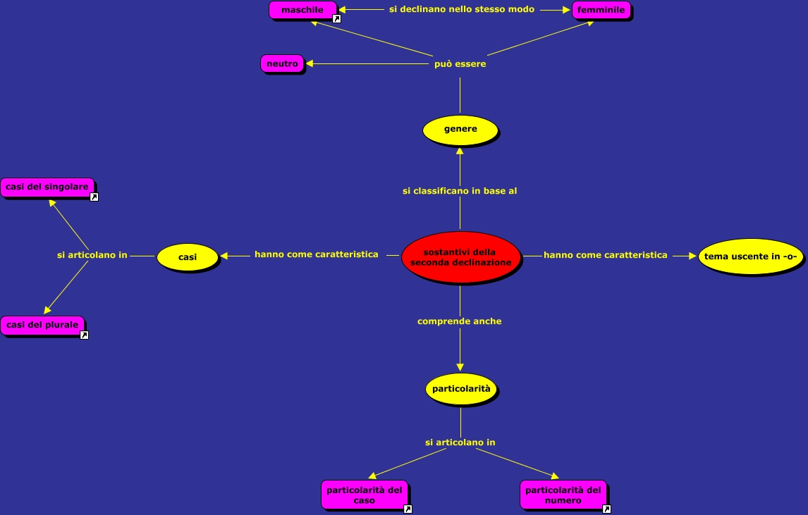 Seconda declinazione, sostantivi della seconda declinazione hanno come caratteristica tema uscente in -o-, genere può essere maschile, sostantivi della seconda declinazione hanno come caratteristica casi, sostantivi della seconda declinazione comprende anche particolarità, genere può essere neutro, particolarità si articolano in particolarità del caso, casi si articolano in casi del singolare, casi si articolano in casi del plurale, genere può essere femminile, sostantivi della seconda declinazione si classificano in base al genere