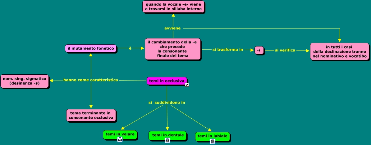 Temi in occlusiva della terza declinazione, temi in occlusiva si suddividono in temi in dentale, temi in occlusiva si suddividono in temi in labiale, il mutamento fonetico è il cambiamento della -e che precede la consonante finale del tema, il cambiamento della -e che precede la consonante finale del tema avviene in tutti i casi della declinazione tranne nel nominativo e vocatibo, temi in occlusiva hanno come caratteristica tema terminante in consonante occlusiva, il cambiamento della -e che precede la consonante finale del tema si trasforma in -i, -i si verifica in tutti i casi della declinazione tranne nel nominativo e vocatibo, il cambiamento della -e che precede la consonante finale del tema avviene quando la vocale -e- viene a trovarsi in sillaba interna, temi in occlusiva si suddividono in temi in velare, temi in occlusiva hanno come caratteristica nom. sing. sigmatico (desinenza -s)