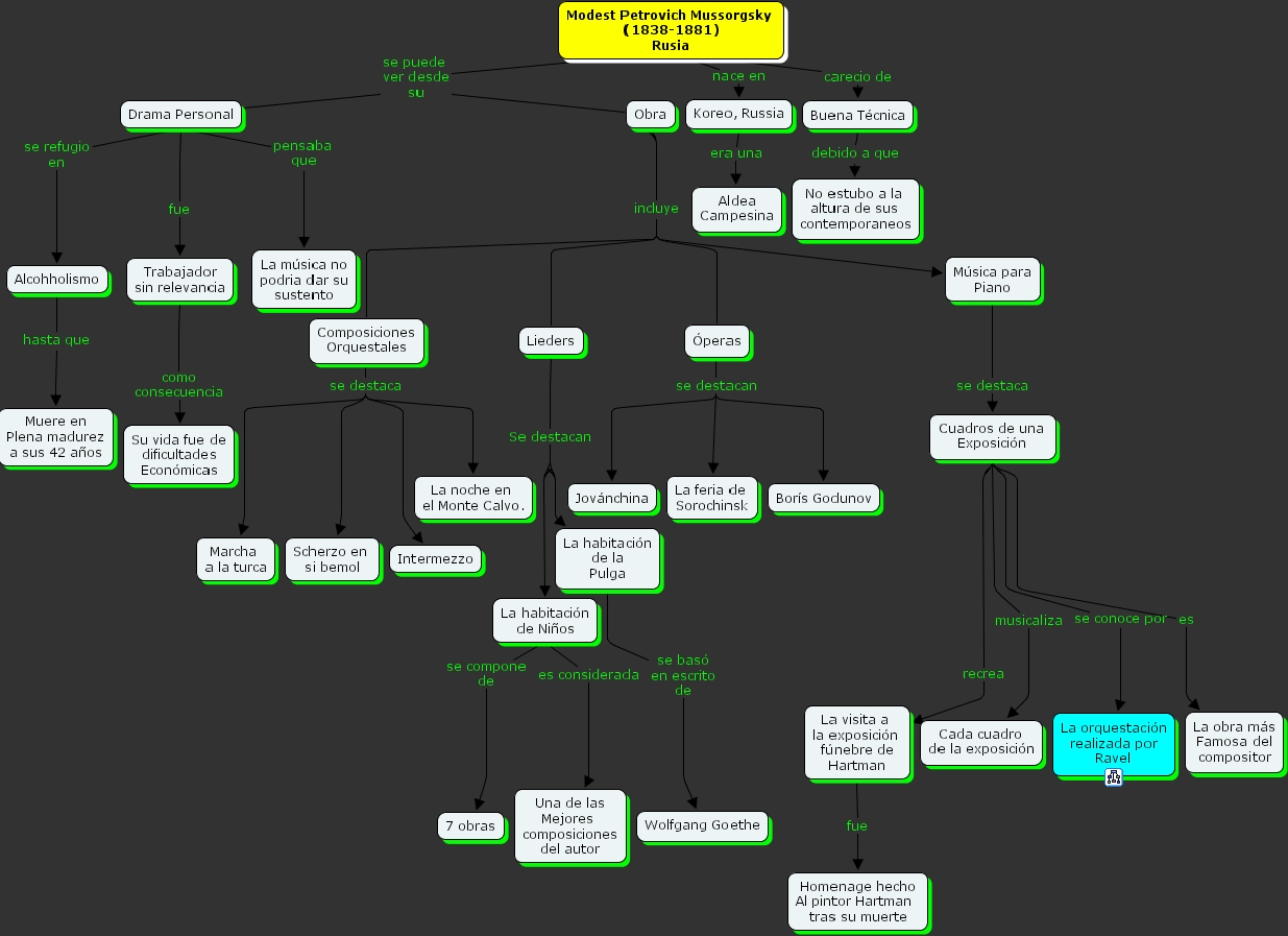 Koreo, Russia era una Aldea Campesina, Drama Personal pensaba que La m�sica no podria dar su sustento, Lieders Se destacan La habitaci�n de la Pulga, Lieders Se destacan La habitaci�n de Ni�os, Cuadros de una Exposici�n se conoce por La orquestaci�n realizada por Ravel, Alcohholismo hasta que Muere en Plena madurez a sus 42 a�os, �peras se destacan Jov�nchina, �peras se destacan Bor�s Godunov, �peras se destacan La feria de Sorochinsk, Drama Personal se refugio en Alcohholismo, Cuadros de una Exposici�n es La obra m�s Famosa del compositor, La habitaci�n de Ni�os se compone de 7 obras, La visita a la exposici�n f�nebre de Hartman fue Homenage hecho Al pintor Hartman tras su muerte, Cuadros de una Exposici�n recrea La visita a la exposici�n f�nebre de Hartman, Modest Petrovich Mussorgsky (1838-1881) Rusia carecio de Buena T�cnica, Trabajador sin relevancia como consecuencia Su vida fue de dificultades Econ�micas, M�sica para Piano se destaca Cuadros de una Exposici�n, Buena T�cnica debido a que No estubo a la altura de sus contemporaneos, Modest Petrovich Mussorgsky (1838-1881) Rusia se puede ver desde su Obra, Modest Petrovich Mussorgsky (1838-1881) Rusia se puede ver desde su Drama Personal, La habitaci�n de Ni�os es considerada Una de las Mejores composiciones del autor, Cuadros de una Exposici�n musicaliza Cada cuadro de la exposici�n, Composiciones Orquestales se destaca La noche en el Monte Calvo., Composiciones Orquestales se destaca Marcha a la turca, Composiciones Orquestales se destaca Scherzo en si bemol, Composiciones Orquestales se destaca Intermezzo, Drama Personal fue Trabajador sin relevancia, Obra incluye Lieders, Obra incluye �peras, Obra incluye Composiciones Orquestales, Obra incluye M�sica para Piano, Modest Petrovich Mussorgsky (1838-1881) Rusia nace en Koreo, Russia, La habitaci�n de la Pulga se bas� en escrito de Wolfgang Goethe