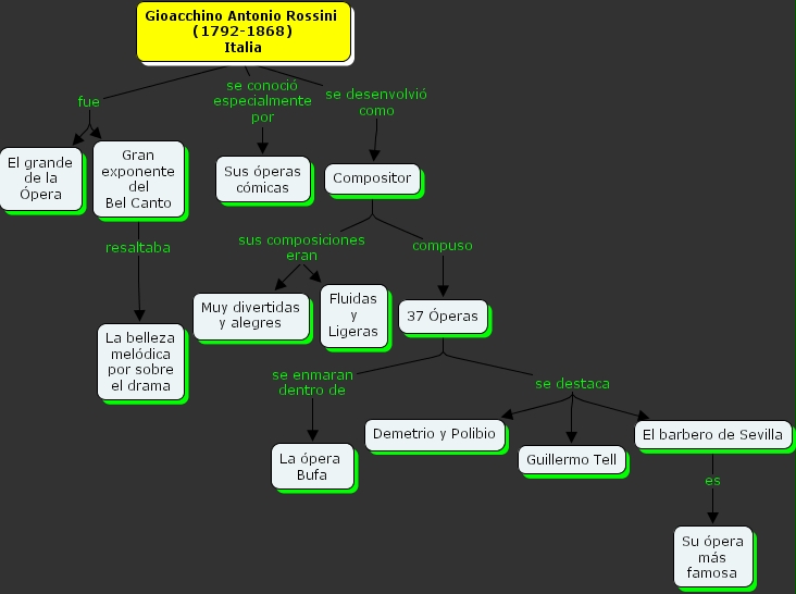 Gioacchino Antonio Rossini (1792-1868) Italia se conoci� especialmente por Sus �peras c�micas, Gioacchino Antonio Rossini (1792-1868) Italia fue El grande de la �pera, Gioacchino Antonio Rossini (1792-1868) Italia fue Gran exponente del Bel Canto, 37 �peras se enmaran dentro de La �pera Bufa, El barbero de Sevilla es Su �pera m�s famosa, Gioacchino Antonio Rossini (1792-1868) Italia se desenvolvi� como Compositor, Compositor compuso 37 �peras, 37 �peras se destaca El barbero de Sevilla, 37 �peras se destaca Guillermo Tell, 37 �peras se destaca Demetrio y Polibio, Gran exponente del Bel Canto resaltaba La belleza mel�dica por sobre el drama, Compositor sus composiciones eran Fluidas y Ligeras, Compositor sus composiciones eran Muy divertidas y alegres