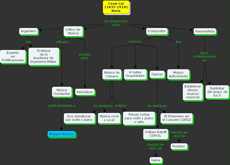 �peras se destacan William Ratciff (1869), , �peras se destacan El Prisionero en el Caucaso (1882), Cesar Cui (1835-1918) Rusia se desenvolvi� como Nacionalista, Cesar Cui (1835-1918) Rusia se desenvolvi� como Cr�tico de M�sica, Cesar Cui (1835-1918) Rusia se desenvolvi� como Ingeniero, Cesar Cui (1835-1918) Rusia se desenvolvi� como Compositor, Nacionalista hace contribuciones en Establecer idioma musical nacional, Nacionalista hace contribuciones en Publicitar del grupo de los 5, M�sica de C�mara incluye Piezas cortas para viol�n y piano o cello, Compositor compuso 4 Suites Orquestales, Compositor compuso M�sica de C�mara, Compositor compuso �peras, Cr�tico de M�sica escribia para Peri�dicos, Compositor fue M�sico Autodidacta, William Ratciff (1869), basada en obra de Heine, Cr�tico de M�sica criticaba M�sica Occidental, El Prisionero en el Caucaso (1882) basada en obra de Pushkin , M�sica de C�mara se destacan M�sica coral y vocal, M�sica de C�mara se destacan Dos miniaturas par viol�n y piano , Ingeniero fue Experto en Fortificaciones, Ingeniero fue Profesor de la Academia de Ingenier�a Militar , M�sica Occidental particularmente a Richard Strauss