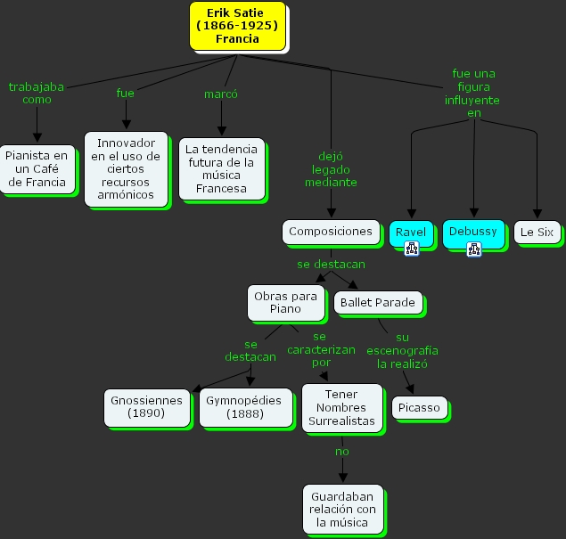 Composiciones se destacan Ballet Parade, Composiciones se destacan Obras para Piano, Erik Satie (1866-1925) Francia trabajaba como Pianista en un Caf� de Francia, Erik Satie (1866-1925) Francia dej� legado mediante Composiciones, Ballet Parade su escenograf�a la realiz� Picasso, Obras para Piano se destacan Gnossiennes (1890), Obras para Piano se destacan Gymnop�dies (1888), Erik Satie (1866-1925) Francia fue una figura influyente en Le Six, Erik Satie (1866-1925) Francia fue una figura influyente en Ravel, Erik Satie (1866-1925) Francia fue una figura influyente en Debussy, Obras para Piano se caracterizan por Tener Nombres Surrealistas, Erik Satie (1866-1925) Francia marc� La tendencia futura de la m�sica Francesa, Erik Satie (1866-1925) Francia fue Innovador en el uso de ciertos recursos arm�nicos, Tener Nombres Surrealistas no Guardaban relaci�n con la m�sica