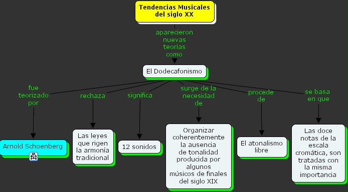 El Dodecafonismo significa 12 sonidos, El Dodecafonismo rechaza Las leyes que rigen la armon�a tradicional, El Dodecafonismo surge de la necesidad de Organizar coherentemente la ausencia de tonalidad producida por algunos m�sicos de finales del siglo XIX, El Dodecafonismo se basa en que Las doce notas de la escala crom�tica, son tratadas con la misma importancia, El Dodecafonismo fue teorizado por Arnold Schoenberg, Tendencias Musicales del siglo XX aparecieron nuevas teor�as como El Dodecafonismo, El Dodecafonismo procede de El atonalismo libre