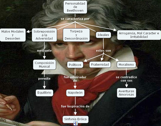 Sobreposici�n a la Adversidad mediante Composici�n Musical, Napole�n fue inspiraci�n de Sinfon�a Er�ica, Pol�ticos fue admirador de Napole�n, Moralismo se contradice con sus Aventuras Amorosas, Composici�n Musical permite Equilibrio, Ideales estos son Pol�ticos, Ideales estos son Moralismo, Ideales estos son Fraternidad, Personalidad de Beethoven se caracteriza por Ideales, Personalidad de Beethoven se caracteriza por Torpeza y Descordinaci�n, Personalidad de Beethoven se caracteriza por Sobreposici�n a la Adversidad, Personalidad de Beethoven se caracteriza por Arrogancia, Mal Caracter e Irritabilidad, Personalidad de Beethoven se caracteriza por Malos Modales y Desorden