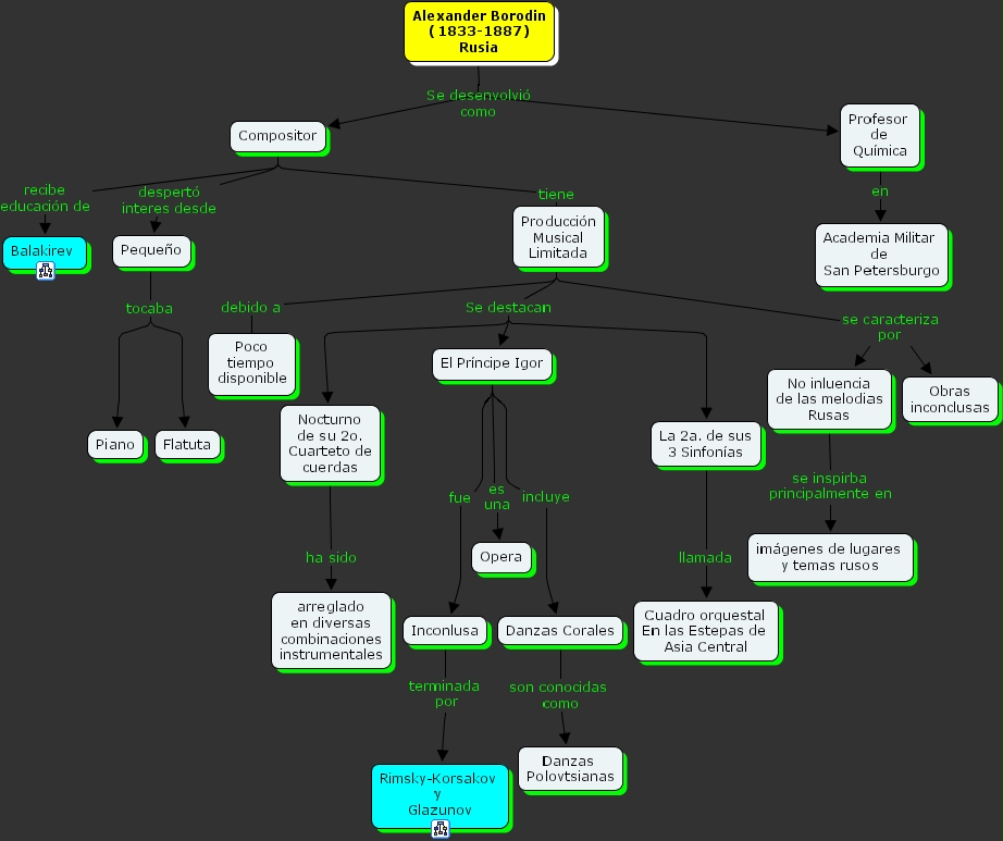 Danzas Corales son conocidas como Danzas Polovtsianas, Compositor despert� interes desde Peque�o, Alexander Borodin (1833-1887) Rusia Se desenvolvi� como Profesor de Qu�mica, Alexander Borodin (1833-1887) Rusia Se desenvolvi� como Compositor, Producci�n Musical Limitada Se destacan El Pr�ncipe Igor, Producci�n Musical Limitada Se destacan La 2a. de sus 3 Sinfon�as, Producci�n Musical Limitada Se destacan Nocturno de su 2o. Cuarteto de cuerdas, Peque�o tocaba Flatuta, Peque�o tocaba Piano, Producci�n Musical Limitada debido a Poco tiempo disponible, La 2a. de sus 3 Sinfon�as llamada Cuadro orquestal En las Estepas de Asia Central, Inconlusa terminada por Rimsky-Korsakov y Glazunov, El Pr�ncipe Igor es una Opera, El Pr�ncipe Igor incluye Danzas Corales, El Pr�ncipe Igor fue Inconlusa, Producci�n Musical Limitada se caracteriza por Obras inconclusas, Producci�n Musical Limitada se caracteriza por No inluencia de las melodias Rusas, Nocturno de su 2o. Cuarteto de cuerdas ha sido arreglado en diversas combinaciones instrumentales, No inluencia de las melodias Rusas se inspirba principalmente en im�genes de lugares y temas rusos, Compositor tiene Producci�n Musical Limitada, Profesor de Qu�mica en Academia Militar de San Petersburgo, Compositor recibe educaci�n de Balakirev