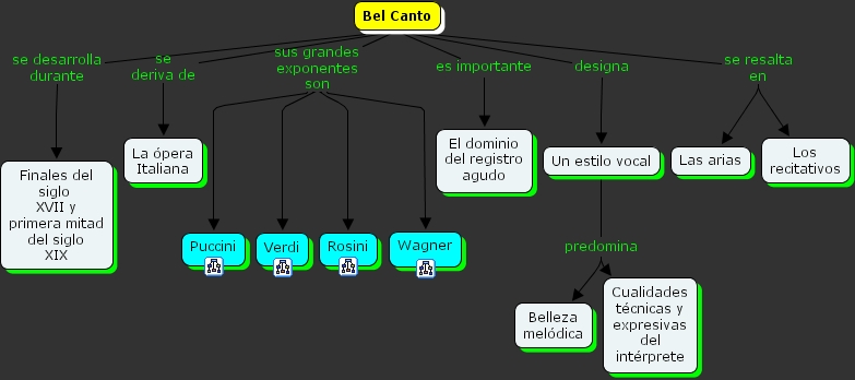 Un estilo vocal predomina Cualidades t�cnicas y expresivas del int�rprete, Un estilo vocal predomina Belleza mel�dica, Bel Canto se resalta en Las arias, Bel Canto se resalta en Los recitativos, Bel Canto designa Un estilo vocal, Bel Canto sus grandes exponentes son Puccini, Bel Canto sus grandes exponentes son Rosini, Bel Canto sus grandes exponentes son Wagner, Bel Canto sus grandes exponentes son Verdi, Bel Canto se deriva de La �pera Italiana, Bel Canto es importante El dominio del registro agudo, Bel Canto se desarrolla durante Finales del siglo XVII y primera mitad del siglo XIX