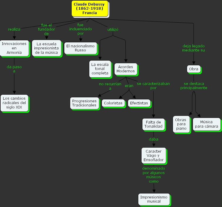 Caracter Vago y Enso�ador denominado por algunos m�sicos como Impresionismo musical, Claude Debussy (1862-1918) Francia realiza Innovaciones en Armon�a, Claude Debussy (1862-1918) Francia utiliz� La escala tonal completa, Claude Debussy (1862-1918) Francia utiliz� Acordes Modernos, Acordes Modernos no recurr�an a Progresiones Tradicionales, Claude Debussy (1862-1918) Francia fue incluenciado por El nacionalismo Russo, Claude Debussy (1862-1918) Francia deja legado mediante su Obra, Falta de Tonalidad daba Caracter Vago y Enso�ador, Claude Debussy (1862-1918) Francia fue el fundador de La escuela impresionista de la m�sica, Obra se destaca principalmente Obras para piano, Obra se destaca principalmente M�sica para c�mara, Innovaciones en Armon�a da paso a Los cambios radicales del siglo XIX, Acordes Modernos eran Coloristas, Acordes Modernos eran Efectistas, Acordes Modernos se caracterizaban por Falta de Tonalidad